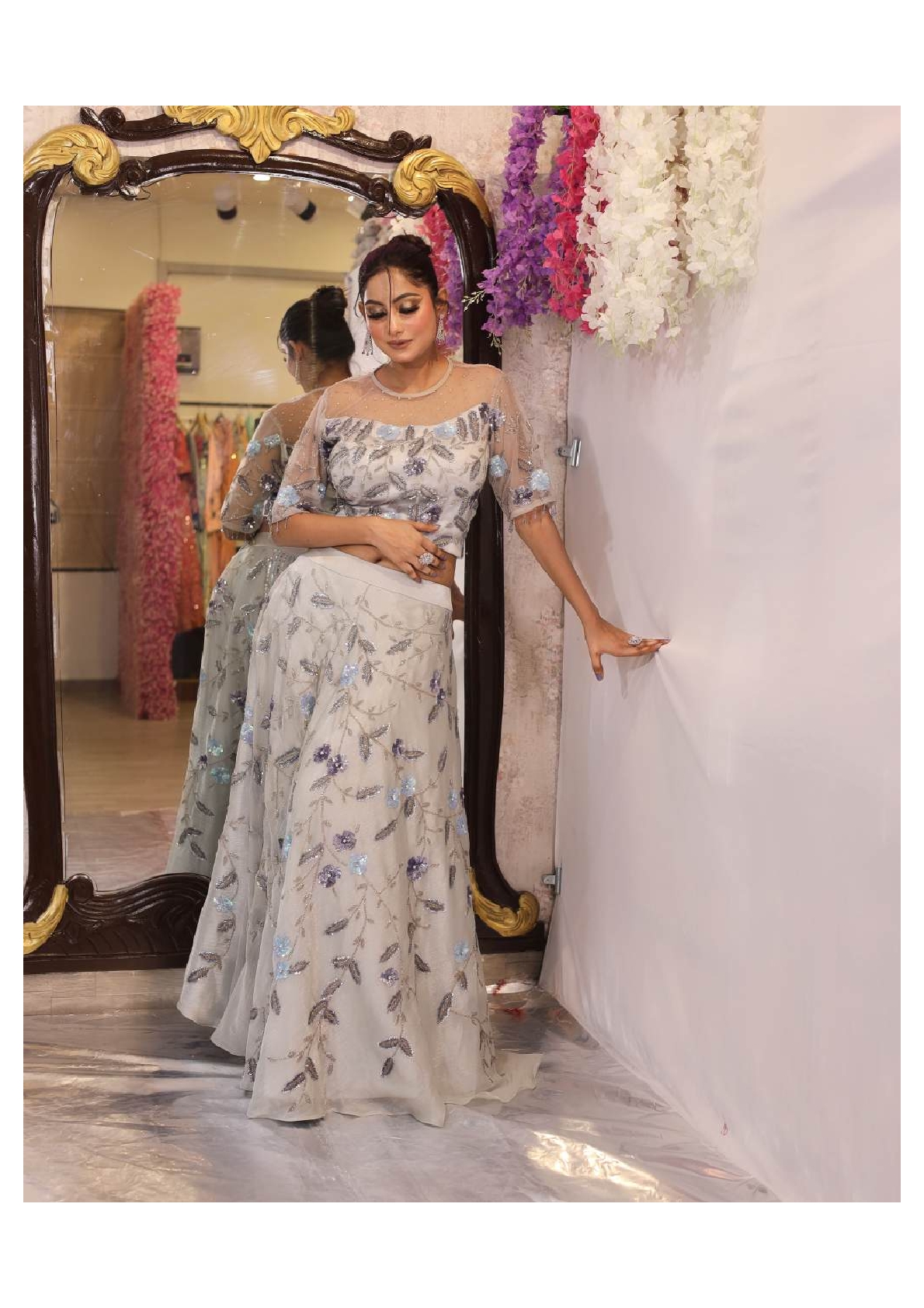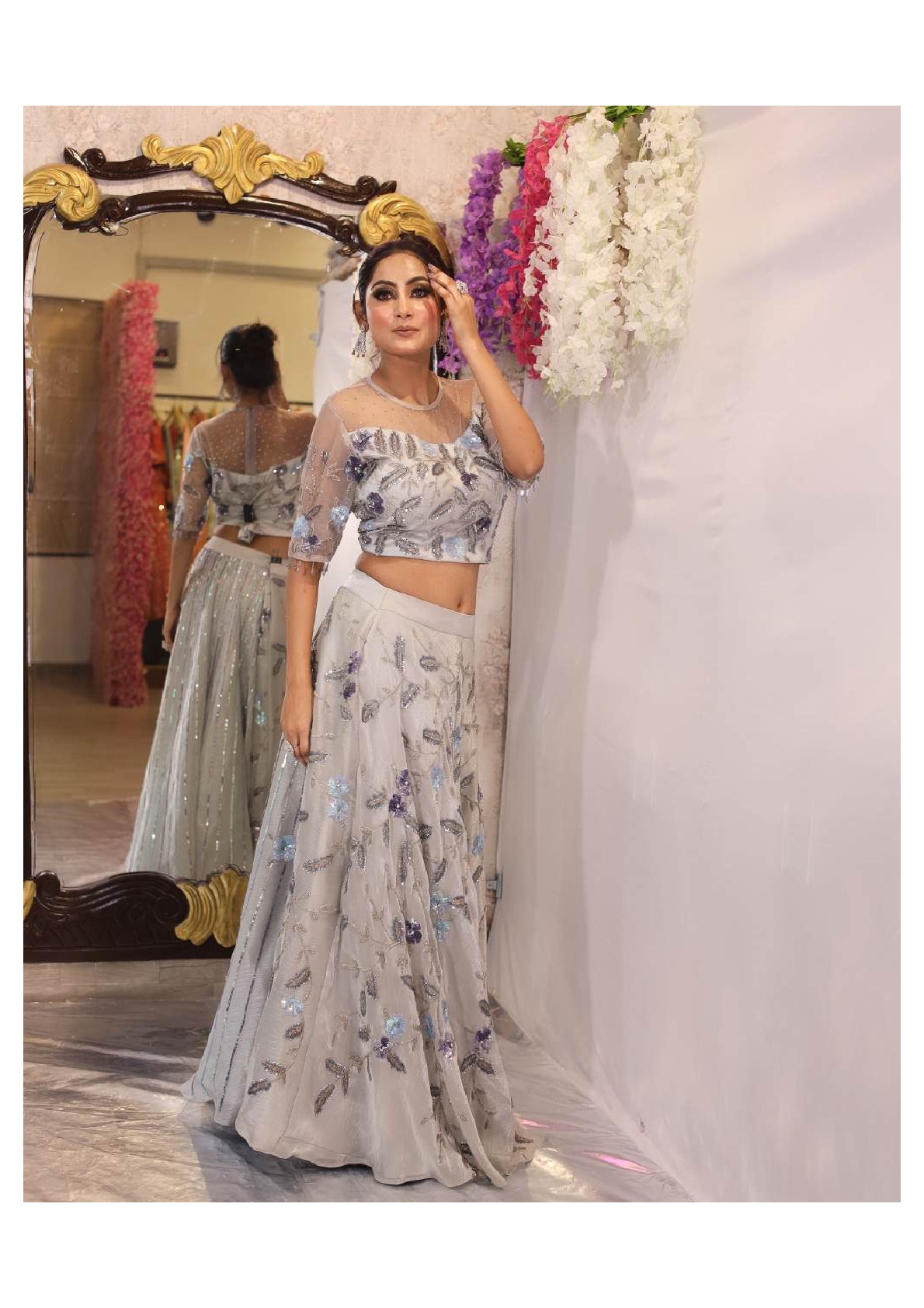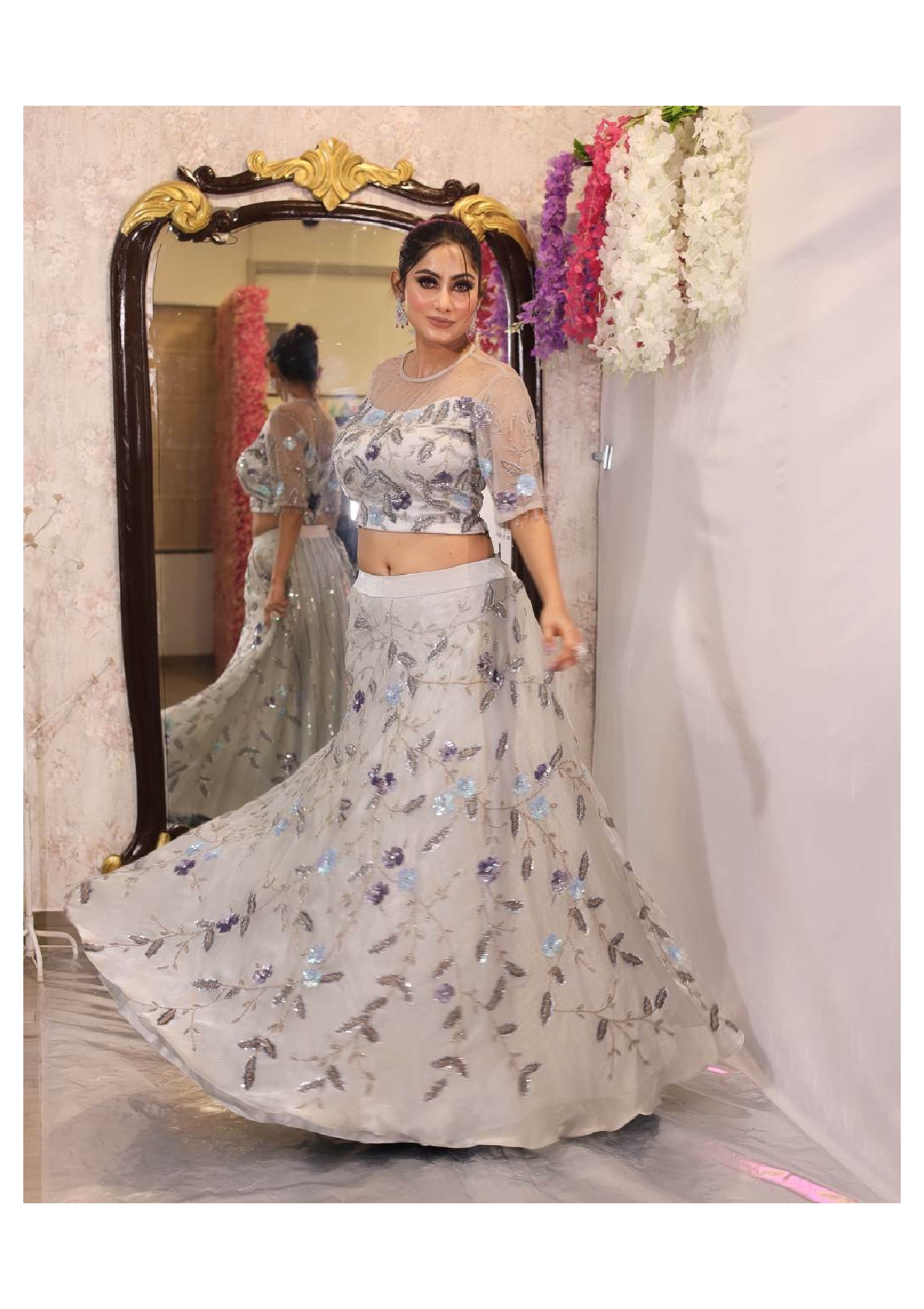 This Grey Skirt, Blouse set offers a chic and modern look with a touch of traditional elegance. The flowy grey organza skirt pairs beautifully with the delicate net blouse, creating a harmonious balance of texture and style. Adorned with intricate cutdana embroidery, the outfit sparkles with refined details. Perfect for cocktail parties or festive occasions, it promises to make you stand out in every crowd. Embrace timeless sophistication with this stunning ensemble that combines comfort and couture.