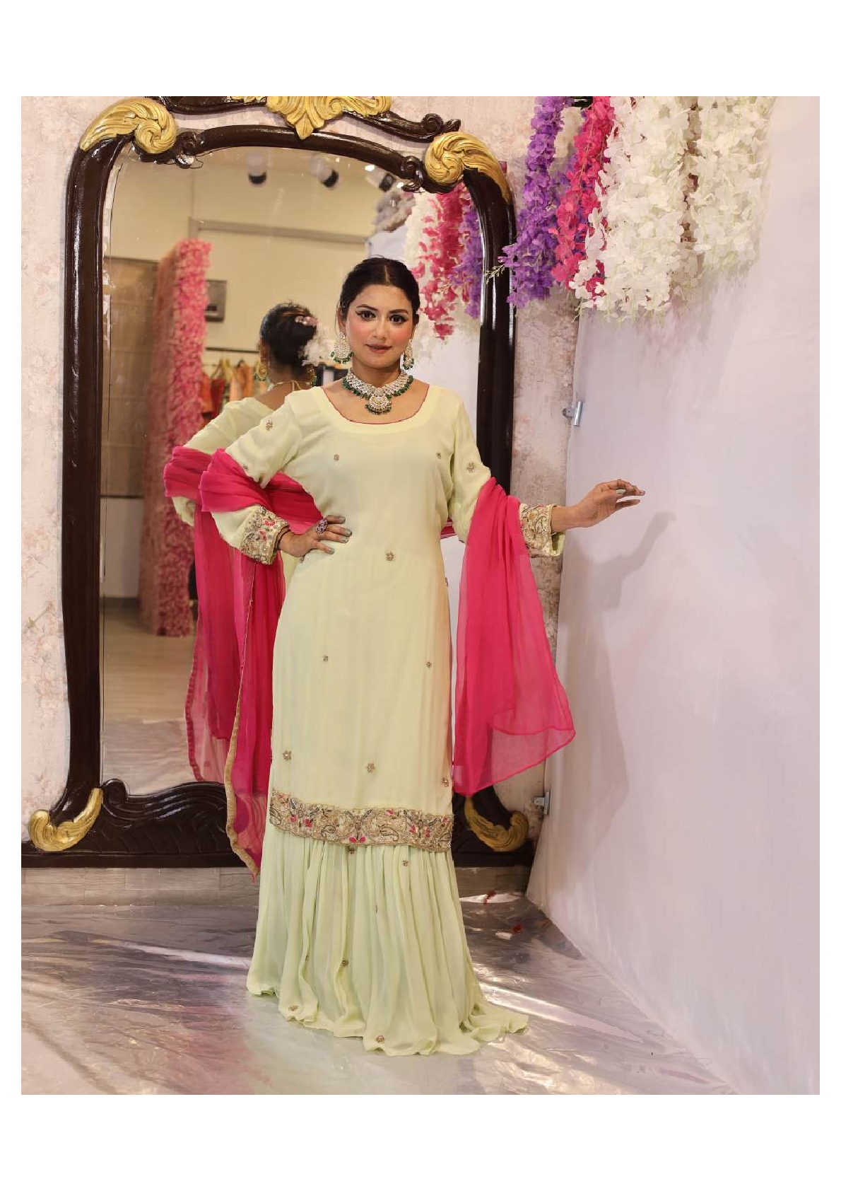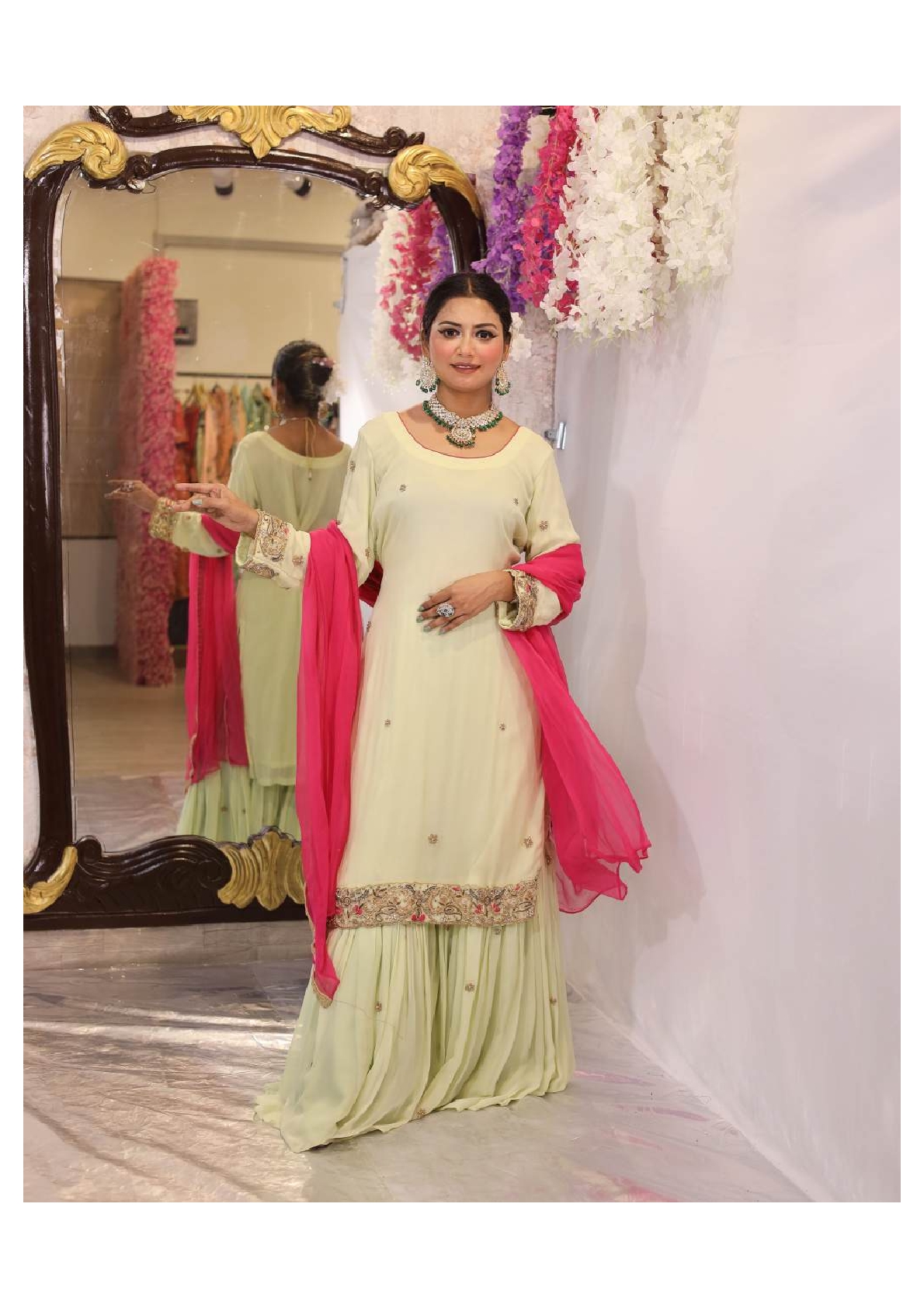 This Lime Green Georgette Kurta Gharara Dupatta Set combines elegance and vibrancy for a stunning ethnic look. The soft Lime green georgette kurta and gharara provide a graceful, flowing silhouette, while the fuchsia pink chiffon dupatta adds a bold pop of color. Intricate zardozi embroidery enhances the ensemble, adding a touch of luxury and sparkle. Perfect for weddings, festivals, or special events, this set exudes charm and sophistication. Elevate your style with this beautifully crafted outfit that effortlessly blends tradition with contemporary appeal.